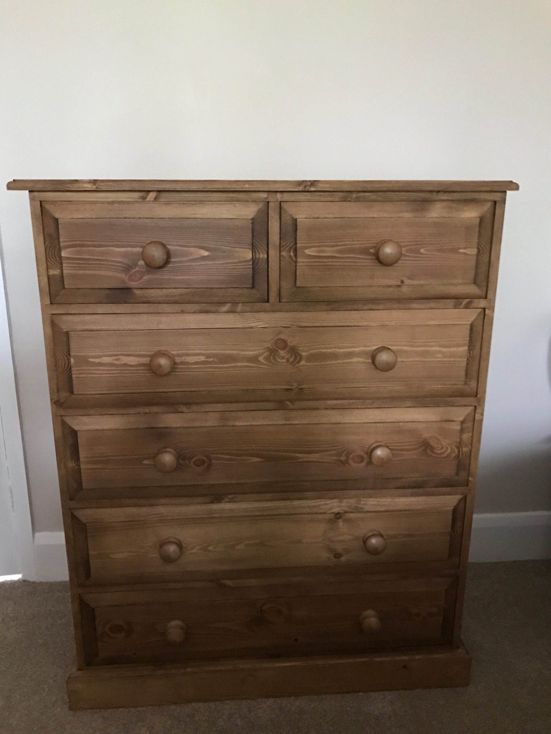 Chest of drawer’s two small over four large, with a raised and fielded top, skirting and drawer’s. All the drawer’s have dovetail joints with solid pine bottom’s and knob’s. This piece of furniture was stained and waxed in a dark oak finish to suit but can also be painted.